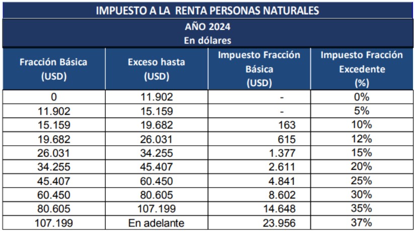 La base exenta para el pago del impuesto a la renta se ha incrementado de USD 11.722 del año 2023 a USD 11.902 para el año fiscal 2024. Esto significa que aquellos contribuyentes que perciban ingresos hasta USD 11.902 estarán exentos del pago de impuesto a la renta en el ejercicio fiscal 2024.