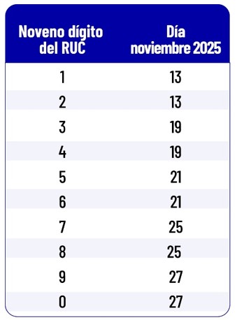 La resolución también establece que, de manera excepcional, las instituciones del Estado, las empresas públicas reguladas por la Ley Orgánica de Empresas Públicas y los contribuyentes especiales, podrán presentar las declaraciones del IVA y Retenciones del mes de septiembre de 2025 hasta noviembre de 2025 (sin que esto cause multas, recargos ni intereses) conforme la siguiente tabla:
