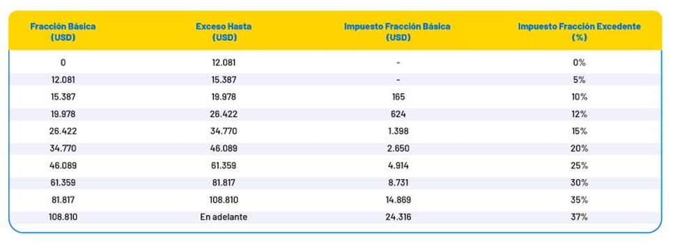 Para calcular el impuesto a la renta causado se restará, de la totalidad de los ingresos gravados, las devoluciones, descuentos, costos, gastos y deducciones atribuibles a esos ingresos. A este resultado se debe aplicar la tabla que se detalla a continuación: